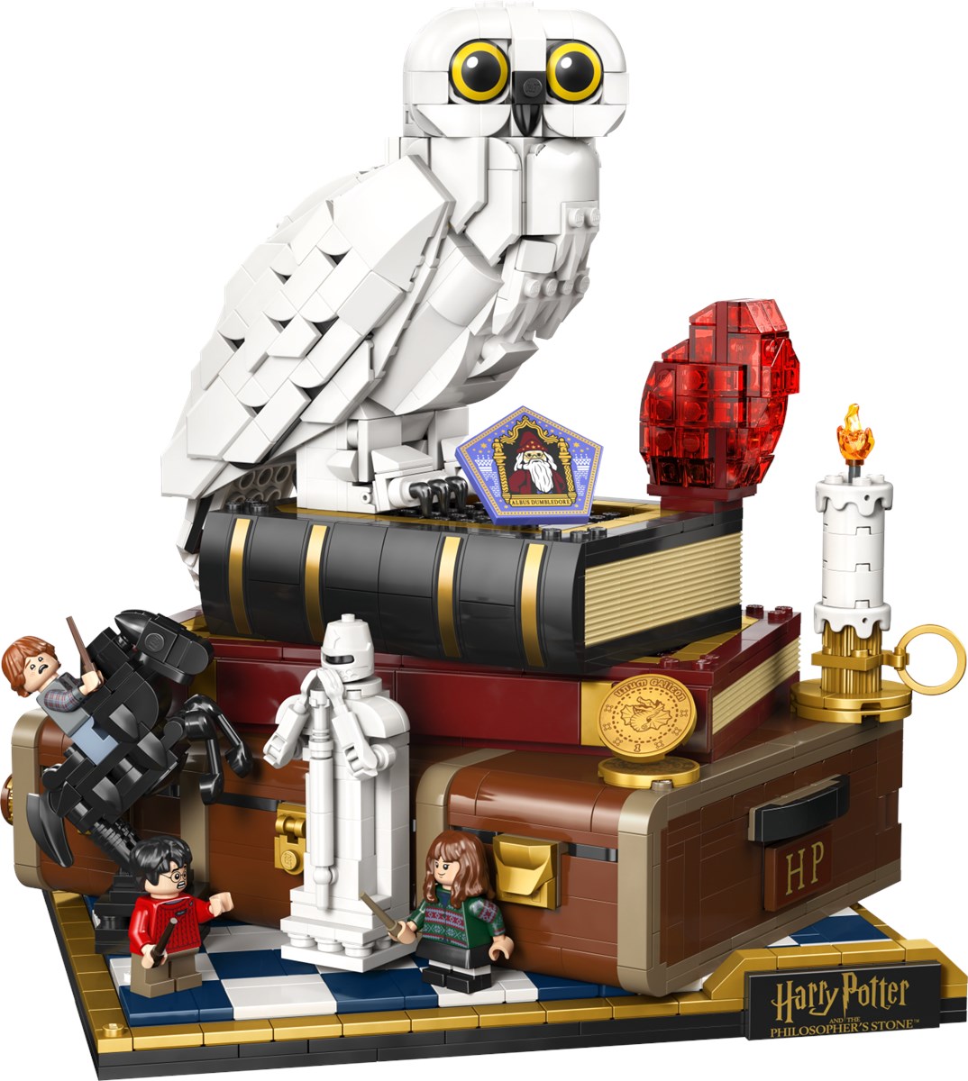 Ten kolekcjonerski zestaw konstrukcyjny to doskonały prezent dla dorosłych fanów Harry'ego Pottera. Zawiera ciekawe funkcje, kultowe postacie i przedmioty, a także klasyczne sceny w mikroskali, które przywołują magiczne wspomnienia. Zbuduj pierwszą figurkę sowy śnieżnej Hedwigi w wersji LEGO ze złożonymi skrzydłami i umieść ją obok KamieniaFilozoficznego na skrzyni Harry'ego Pottera. Dodaj trzy minifigurki LEGO Harry Potter — Harry Potter, Hermiona Granger™ i Ron Weasley™ — oraz przedmioty, takie jak karta z Czekoladowej Żaby i szachy czarodziejów. Użyj trzech pokręteł, aby obrócić głowę Hedwigi, przesunąć królową na szachownicy czarodziejów i otworzyć bok kufra Harry'ego Pottera, który odsłania scenę ataku trolla górskiego w łazience.